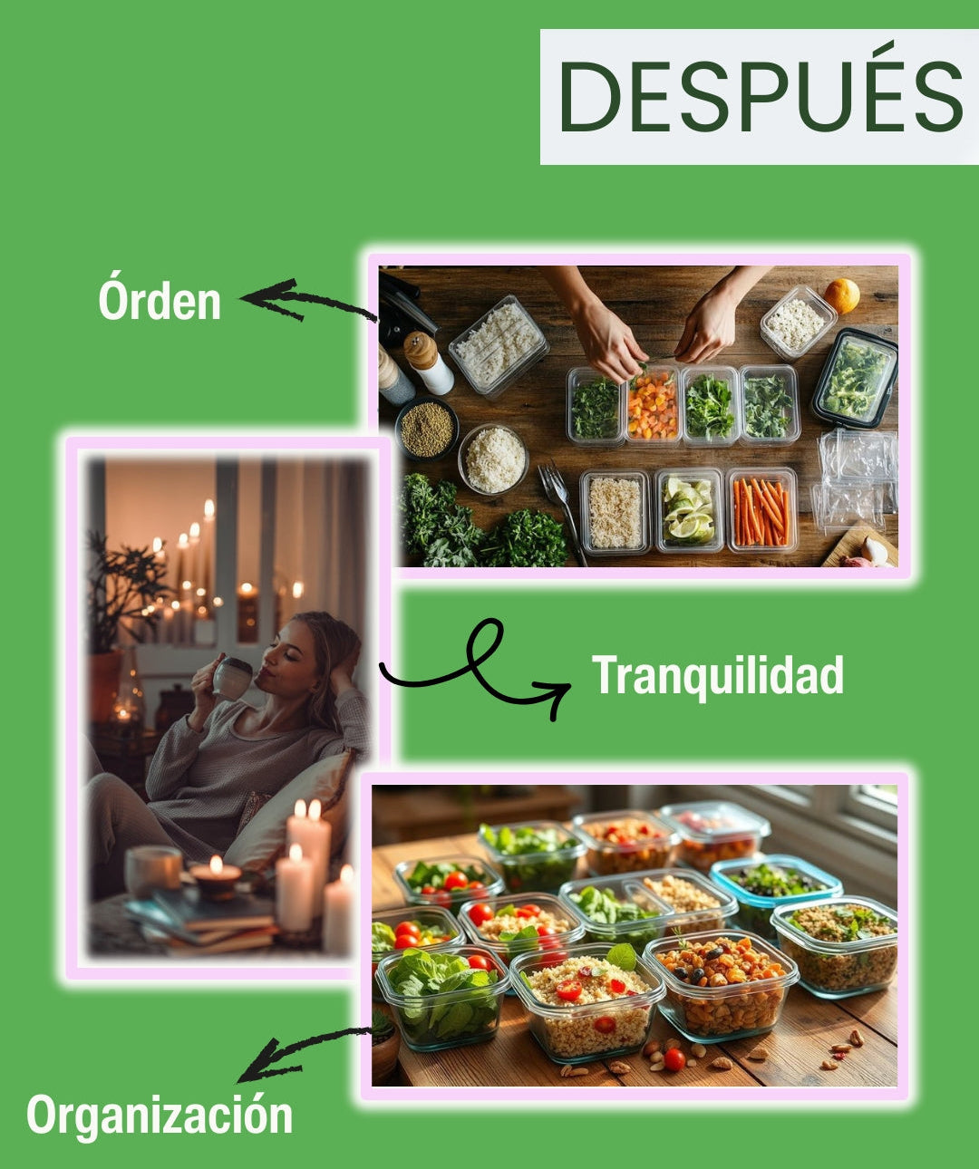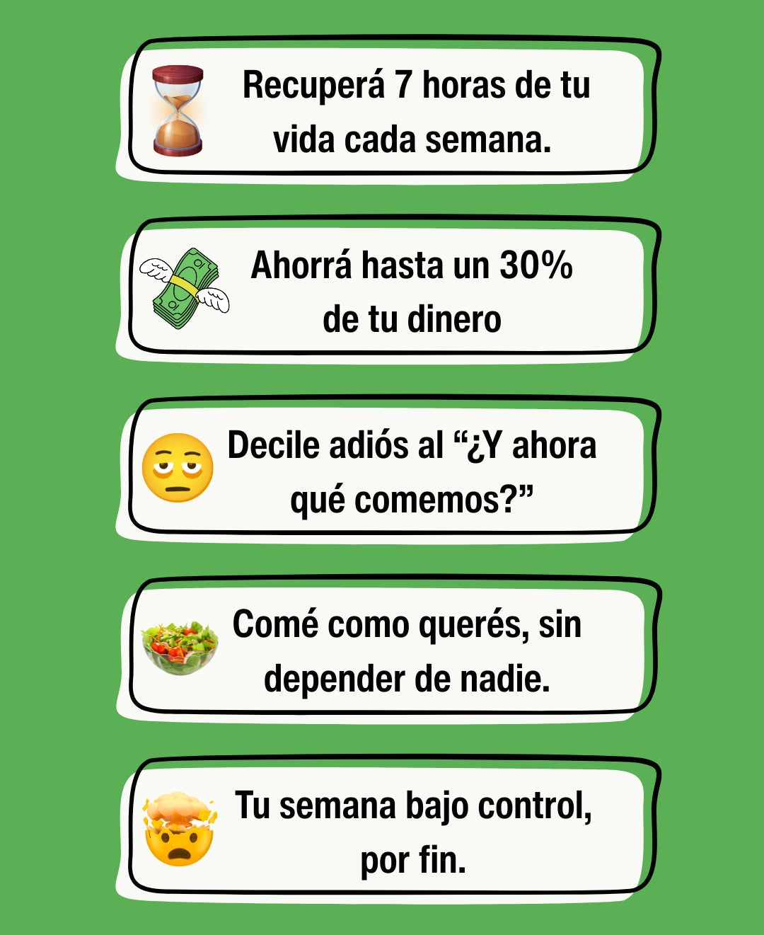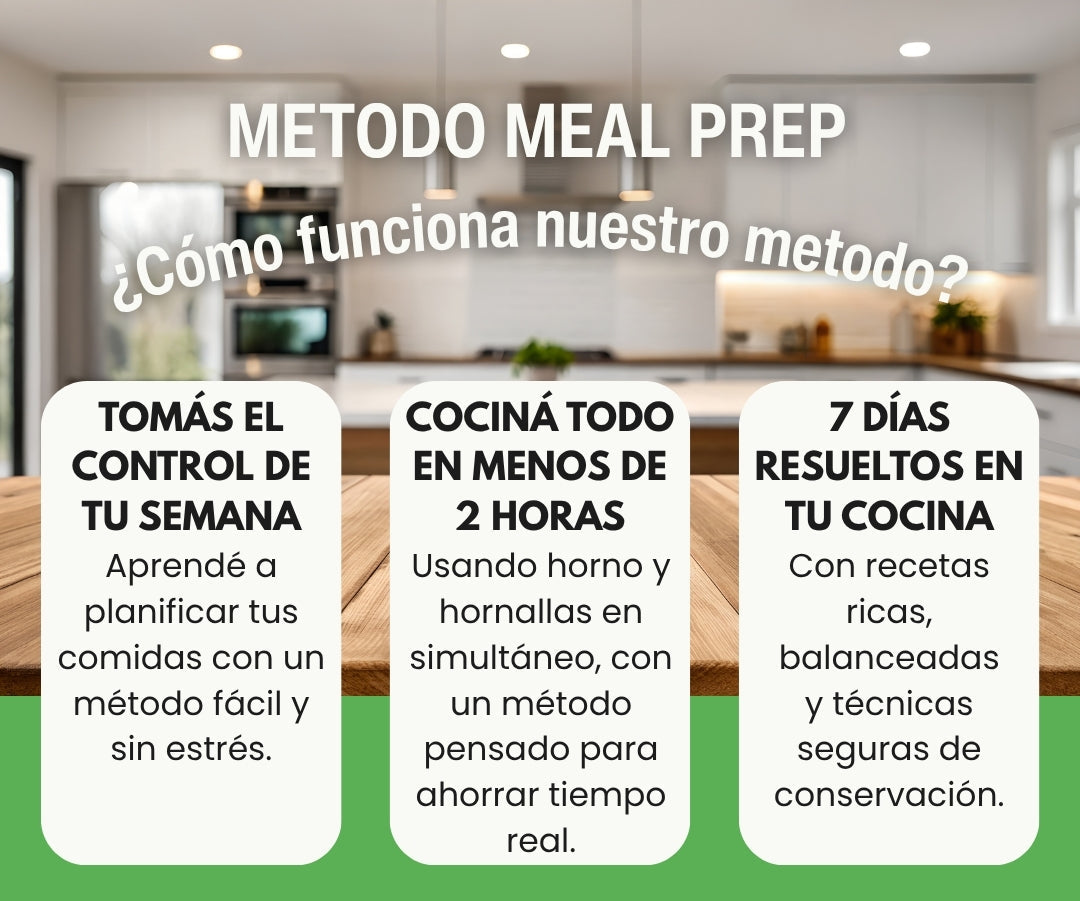 Solo un día de cocina a la semana. En ese día dejás listas tus comidas y ganás 6 días de libertad y organización.